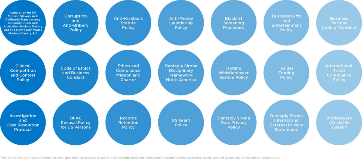 We adhere to the highest ethical standards in all our practices, and ensure we comply with all the relevant laws and regulations that govern our interactions with healthcare professionals. On an annual basis, Dentsply Sirona performs an enterprise risk assessment to identify, prioritize, and respond to the main risks facing the business. Dentsply Sirona reviews ESG factors as a part of the risk universe. In 2020, we amended the Charters of the Corporate Governance and Nominating Committee and the Human Resources Committee to provide explicit oversight of ESG matters. Additionally, as of the end of 2020, no material areas of misalignment with key shareholders with respect to Governance were identified.