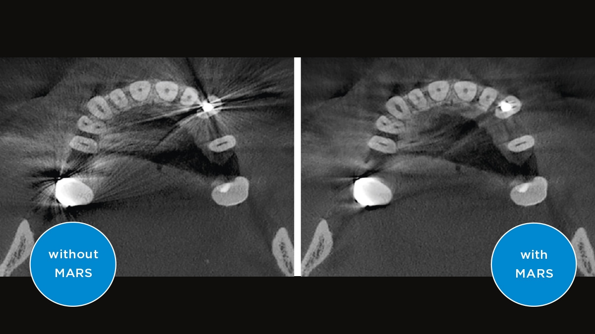 Metal artifacts are a challenge in 3D X-ray imaging. Radiopaque objects create shadowing and streaking effects during the three-dimensional reconstruction and as such interfere with the findings. MARS automatically reduces metal artifacts and facilitates the diagnosis.
