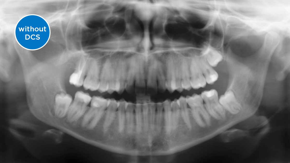 The image shows X-ray images with and without DCS technology. Move the control over the image and see for yourself the difference the DCS sensor makes to the image quality.