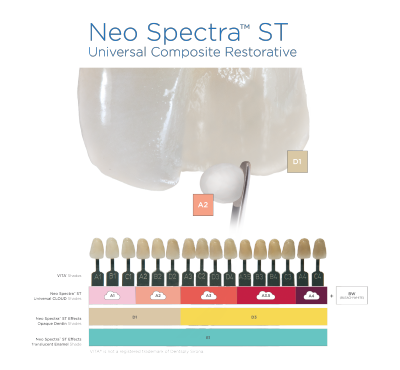 For aesthetically demanding anterior cases, Neo Spectra ST Effects Composite works with Neo Spectra ST Composite in a simplified layering technique.