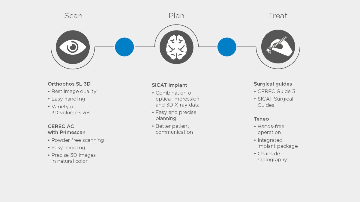 The „intelligently connected workflows“ from Dentsply Sirona, or I-CON workflows for short, are precisely coordinated, highquality products that connect the individual work steps to make a particularly efficient, safe, and flexible workflow due to their software-controlled interfaces.